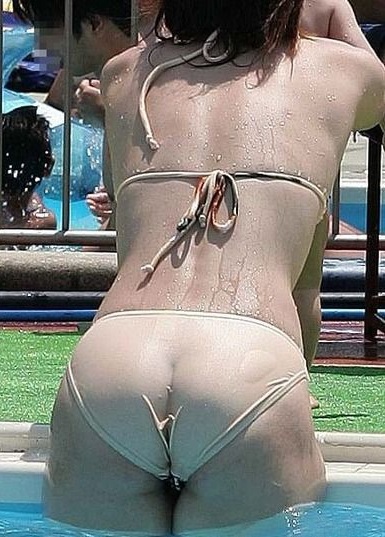 【画像】プールの人妻さん、透け透けビキニで尻のワレメ全開