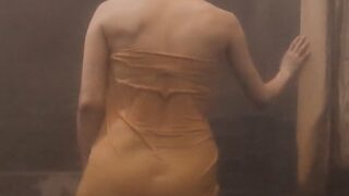 【画像】秘湯ロマンの美人タレントさん、バスタオル越しの尻ラインがそそる